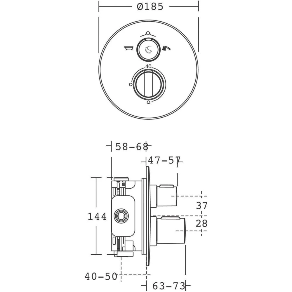 Built-in thermostatic shower bath mixer valve with a round faceplate. Ceramic disc flow control and adjustable temperature limit. Fits into a 43mm wall cavity and features double sealing for water tightness.