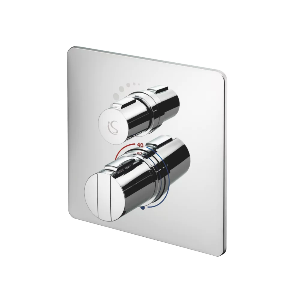 Built-in thermostatic shower bath mixer valve with a square faceplate. Ceramic disc flow control and adjustable temperature limit. Fits into a 43mm wall cavity and features double-sealing for water tightness.