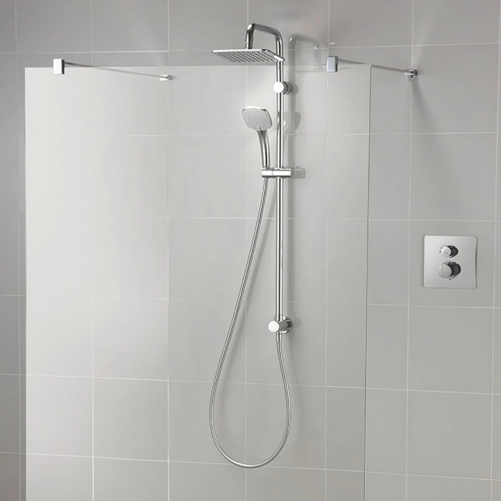 Chromed brass construction. Features push-button handspray, height adjustment and limescale-resistant rub clean nozzles. For use with built-in showers.