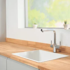 Designed to replace existing main mixer tap. Smooth laminar flow. Dispenses near-boiling filtered water and regular cold water, ideal for a variety of kitchen tasks including making hot drinks. Features adjustable digital thermostat to set preferred temperature between 88-99°C, and automatic shut-off when the lever for hot water is released.