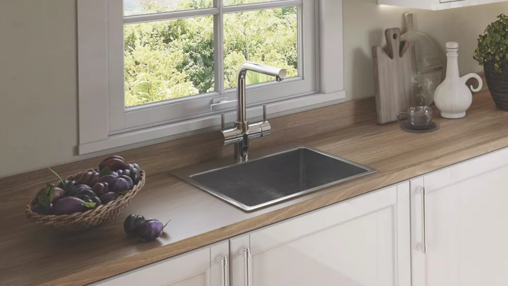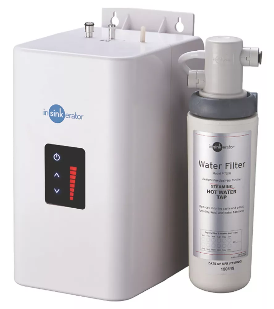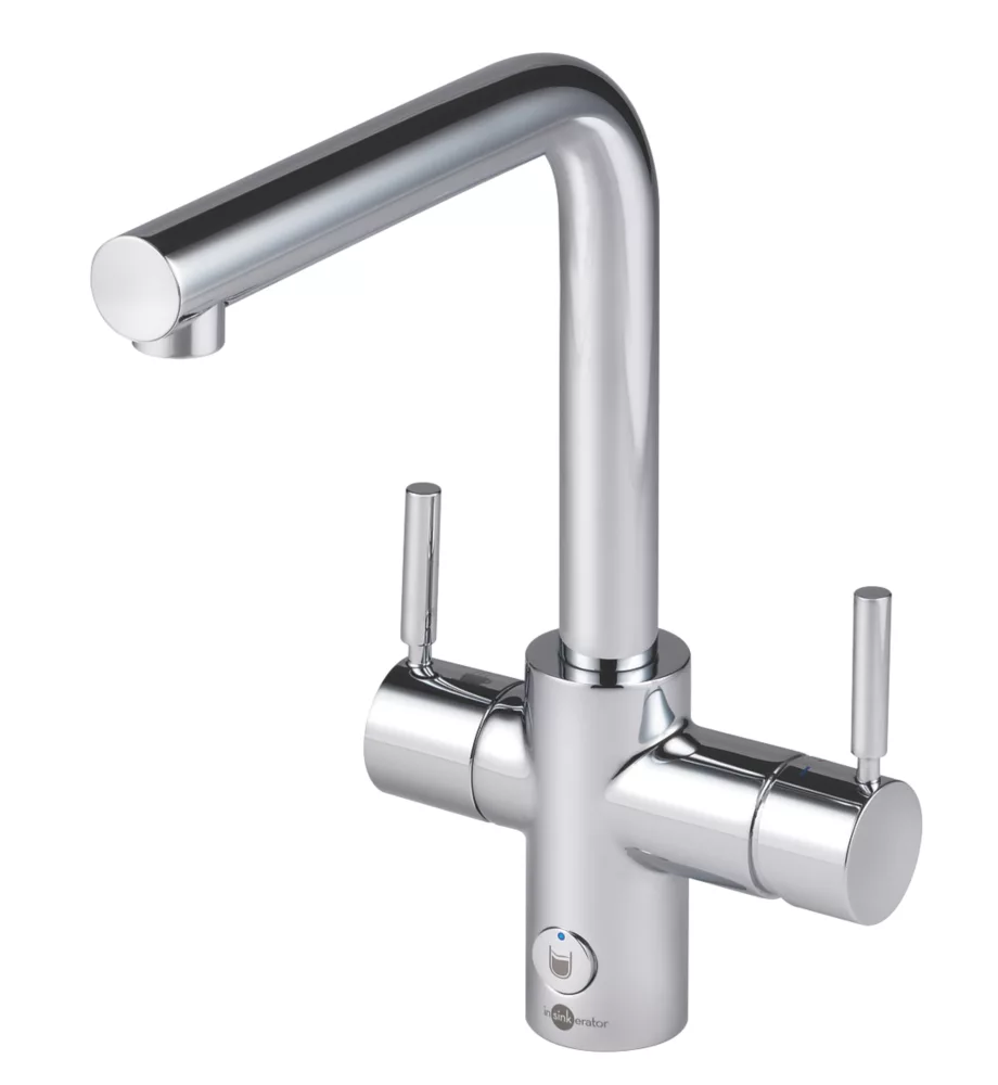 Touch-activated tap. Dispenses cold water which is filtered to remove impurities for improved taste, or near-boiling water which is ideal for making hot drinks and food preparation. Compact and quiet tank sits inside cupboard under the sink and has an adjustable dial to set temperature between 88-99°C. Safety spring lock push-down lever immediately springs back into place to help reduce water wastage and prevent hot water running unattended. Smooth and fine laminar water flow prevents spraying and spitting to reduce risk of scalding or burning.