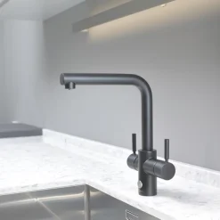Touch-activated tap. Dispenses cold water which is filtered to remove impurities for improved taste, or near-boiling water which is ideal for making hot drinks and food preparation. Compact and quiet tank sits inside cupboard under the sink and has an adjustable dial to set temperature between 88-99°C. Safety spring lock push-down lever immediately springs back into place to help reduce water wastage and prevent hot water running unattended. Smooth and fine laminar water flow prevents spraying and spitting to reduce risk of scalding or burning.