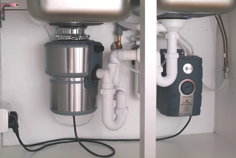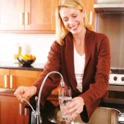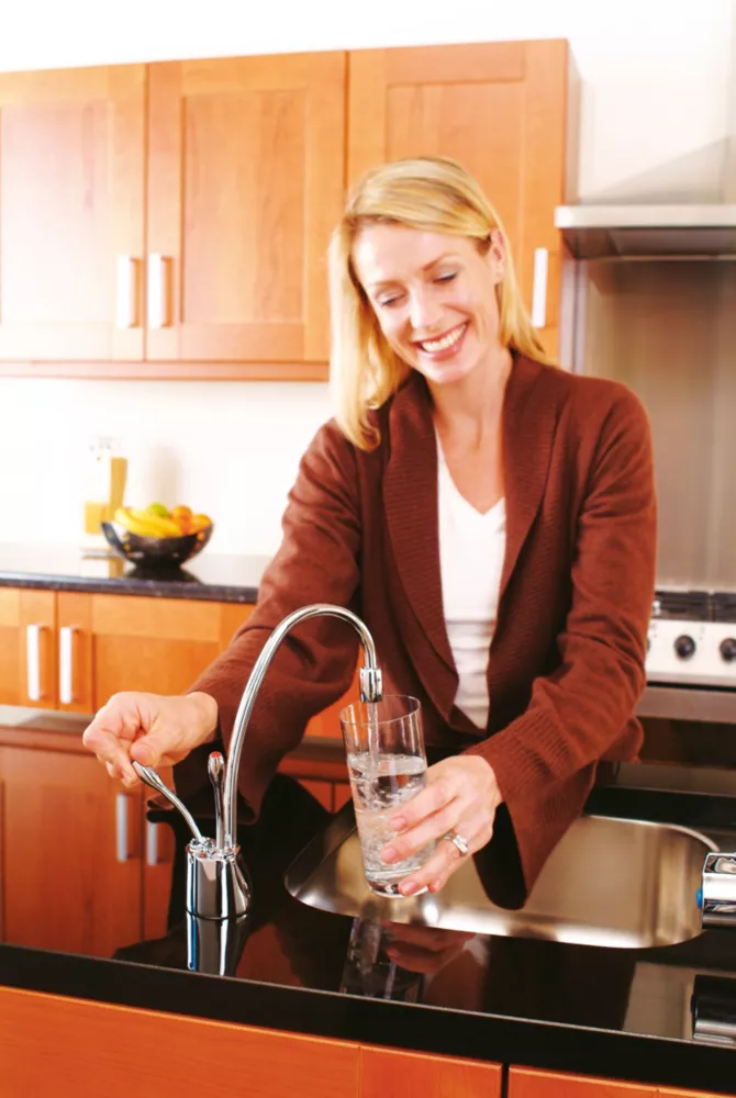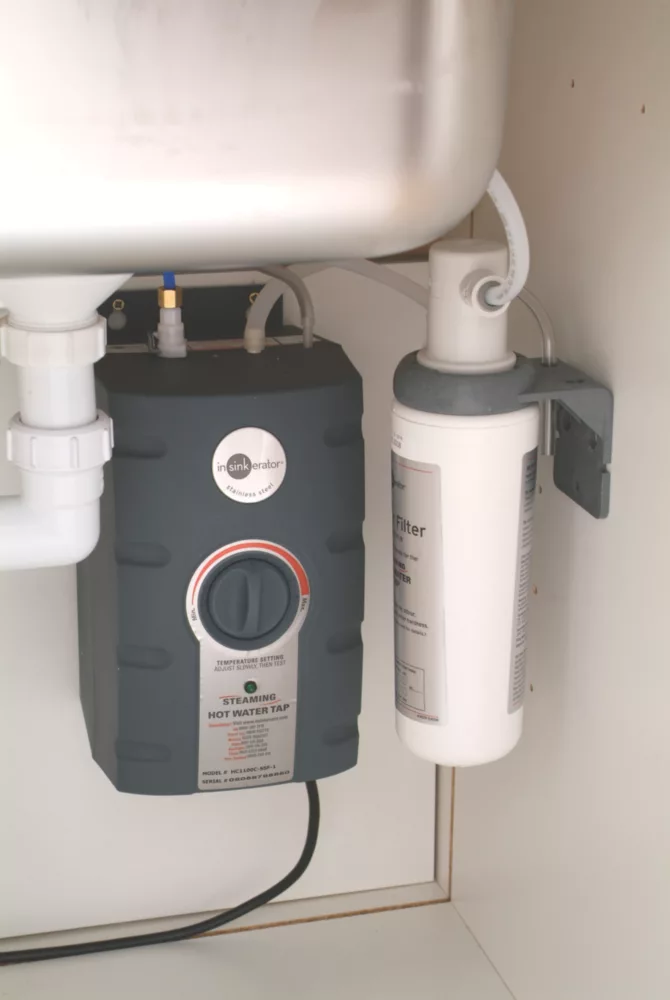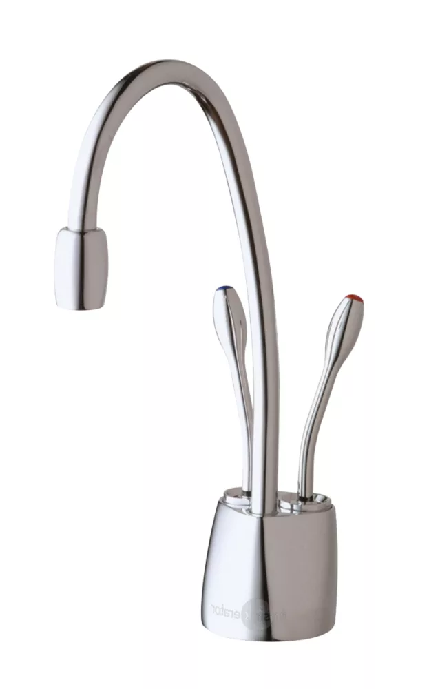 Chrome-plated brass. Elegant twin lever design. Stainless steel tank with heating element. Offers both hot and cold filtered water from the same tap.