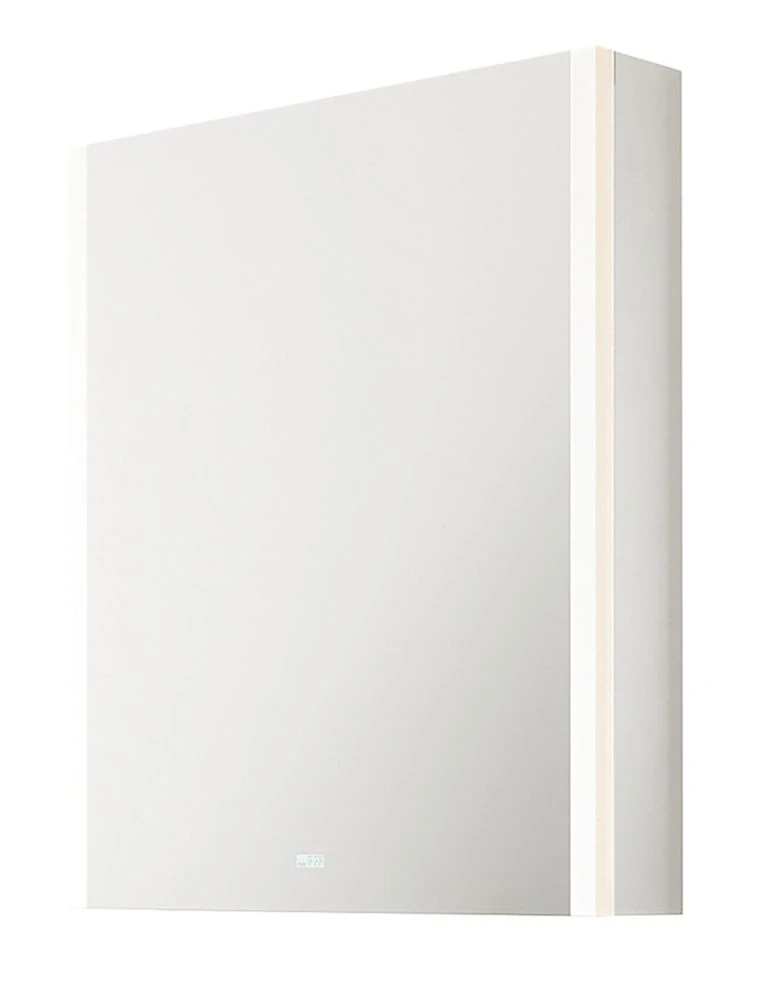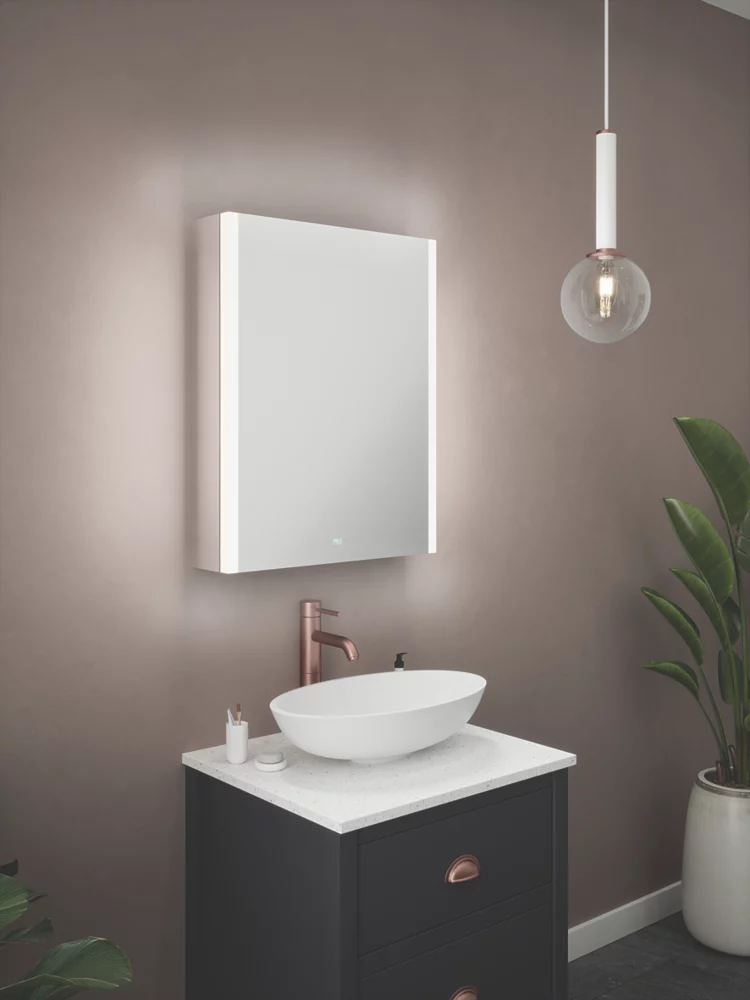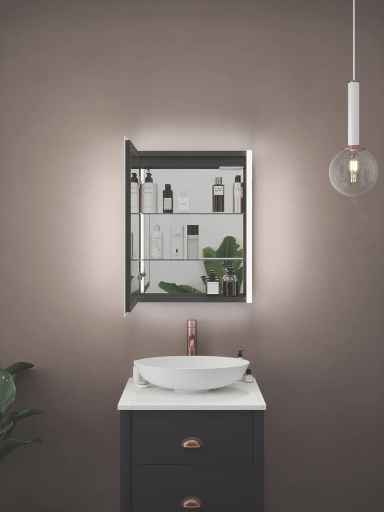 Single-door cabinet with 2 Bluetooth speakers, USB charging port and built-in shaver socket. Features stylish matt black interior with mirrored panels inside doors and 2 adjustable-height glass shelves for storage. Diffused illuminated borders to mirrors on front of cabinet provide a dimmable, uniform light output with no dark spots. Tunable function with 3 colour temperature options. Demister pad offers fog-free mirror. Speakers enable streaming from connected devices, such as smartphones or tablets.