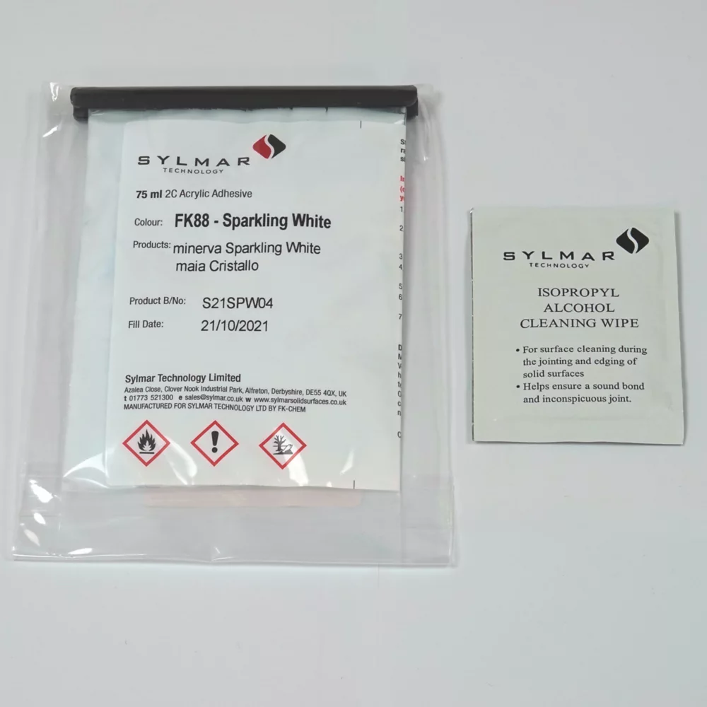 Colour-matched adhesive sachet with isopropyl alcohol wipe.