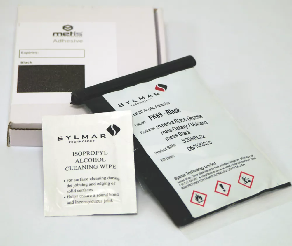 A 75ml sachet of colour-matched adhesive, including an isopropyl alcohol wipe for preparation.