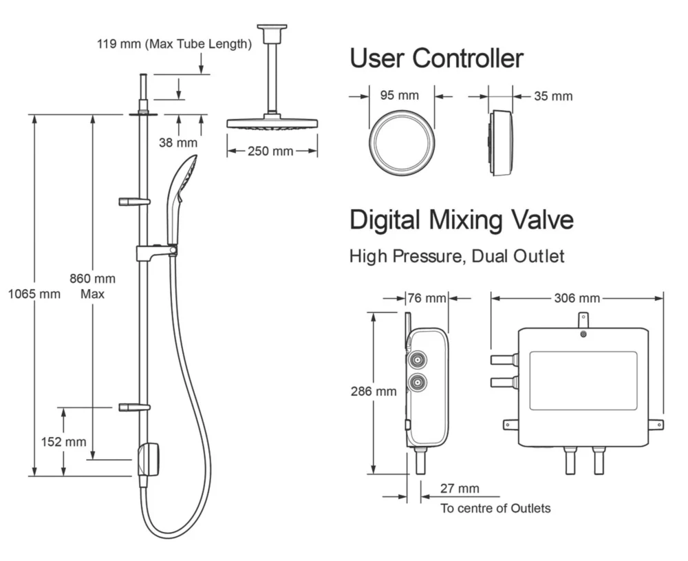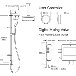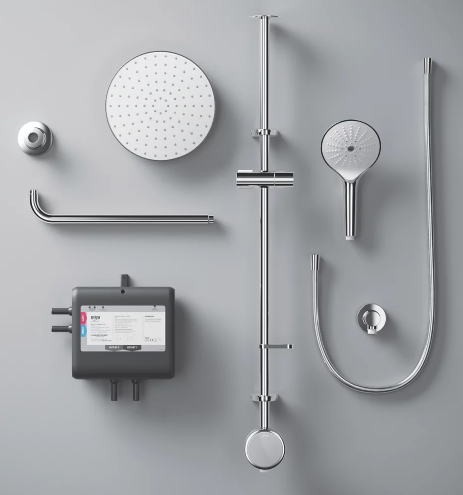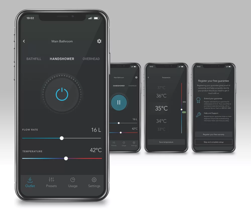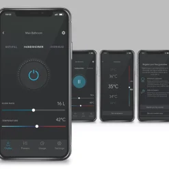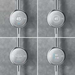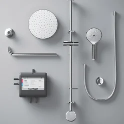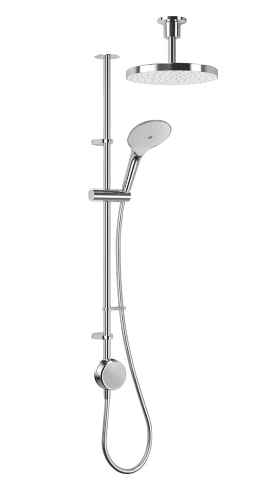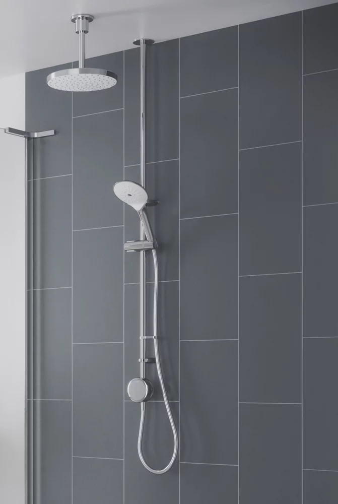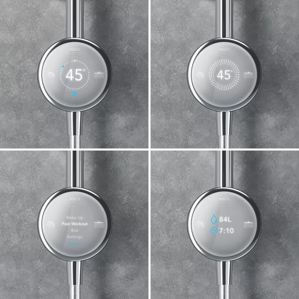 App and voice-enabled digital shower with LED temperature and flow display. Configure and control the shower from a phone using the app or using the intelligent digital controller. Designed to make installation a little easier, includes an external power supply unit with 3m cable for difficult-to-reach power sources. Supplied with a 3-pin plug so no additional wiring required. Fixing points directly retrofit the Aqualisa Quartz. Pre-assembled fittings kit for ease of installation. Slide bar-mounted digital controller requires no drilling through tiles. Multi-fit overhead deluge can be ceiling-fed or rear-fed.