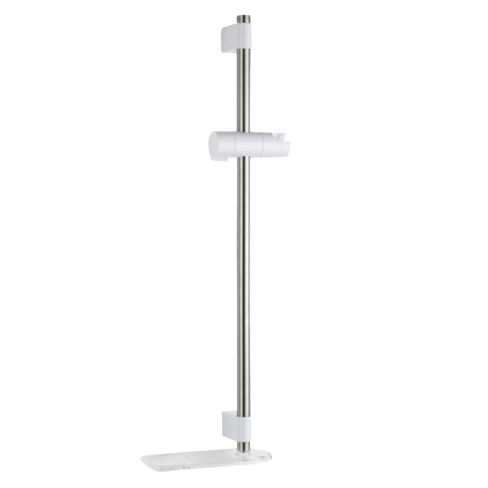 Soap dish with integrated hose-retaining ring / shower gel hook. Adjusts to fit existing screw holes.