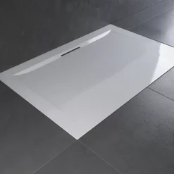 Lightweight and strong shower tray. Can be installed flush to the floor, surface-mounted or on riser legs. Waste has been designed to fit easily between floor joists. Featuring BioCote technogy to help reduce mould and bacteria growth. Waste can be rotated 180° to connect with the waste pipe dependent on installation need. Easy cleaning with the removeable waste trap.