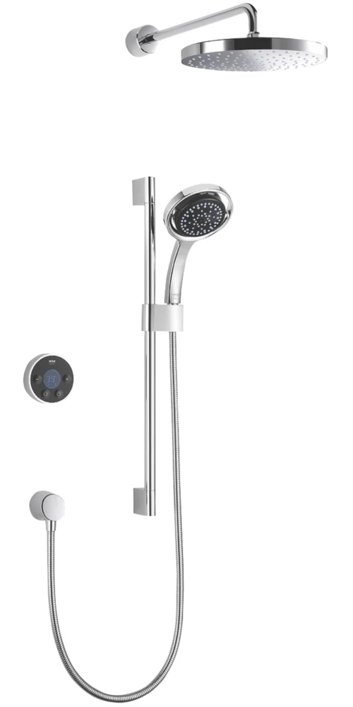 Wireless digital shower with thermostatic temperature stability to keep showering safe for all the family. User can divert between the overhead and separate hand shower or have both on at once. Separate temperature and flow controls to fine-tune the perfect shower. Programmable functions include warm-up mode, clock display and eco setting. Suitable for high pressure systems only. Supplied with chrome deluge head and Mira 360 showerhead.