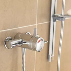 Stylish and safety conscious with thermostatic temperature stability. Cool Shield technology prevents the valve becoming hot during a shower. Magni-Flo gives increased flow even at low pressure. Features easy use levers and easy glide showerhead with extra long slide bar and hose for greater flexibility. Ideal for small spaces as slide bar can be corner mounted.