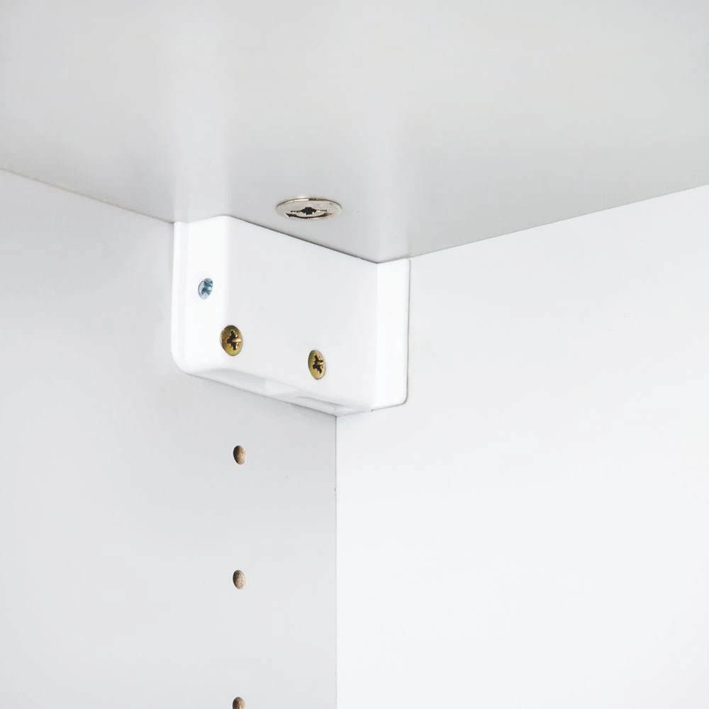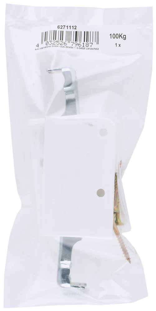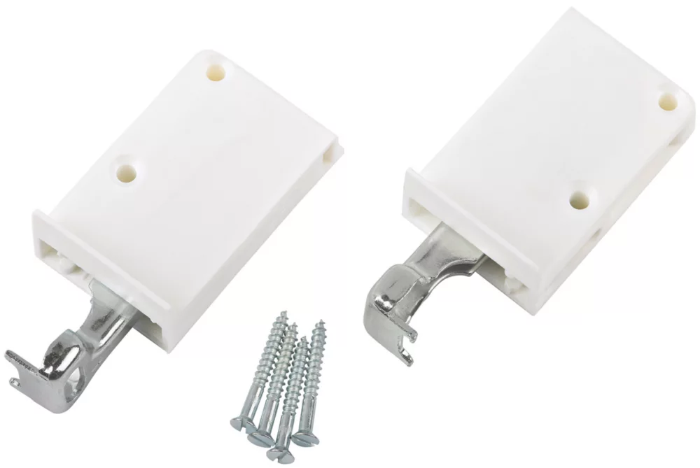 Used to hang up cabinets. Hanger is inserted through a pre-drilled hole of the rear panel. The casing is screw-on of the inside of the cabinet. Align with adjustable height and depth. Contains left and right cabinet suspension hanger. For use with Suki suspension rail.