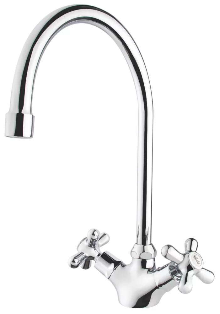 Traditional design with swan neck spout. Chrome finish.
