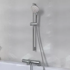 Stylish 2-in-1 design includes shower with longer reach and forceful spray. Easy to divert between bath fill and shower using separate flow and temperature controls. Shower offers 5 different jet types and rub-clean nozzles for easy cleaning. Deck mount elbows allow bath-edge installation and includes adjustable handset holder.