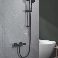 Concentric mixer shower with thermostatic temperature control and an adjustable maximum temperature stop. Features a 3-spray pattern shower head, an integrated flow regulator and easy-to-clean rubber nozzles. Includes handset, hose and fixing kit. Suitable for high and low pressure systems.