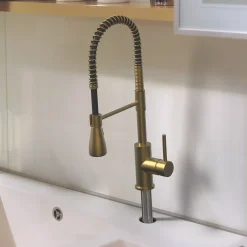 Combines style and functionality with spring neck design and a dual-function spray head spout. Perfect for all kitchen tasks from filling larger vessels to washing hands. Contemporary design with brushed brass finish. Single lever control makes it extremely easy to operate, even one-handed. Ideal for busy kitchens.