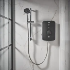 Sleek, elegant and easy to use. Push button start/stop means the shower setting is saved. 5-spray pattern, round shower head. Soft black finish.