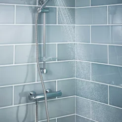 All-chrome thermostatic TMV2 bar mixer shower with separate flow and temperature controls. Features ceramic disc flow control and thermostatic temperature control that maintains selected showering temperature. Adjustable top bracket shower kit with 1.25m anti-twist hose. Supplied with surface fixing brackets.