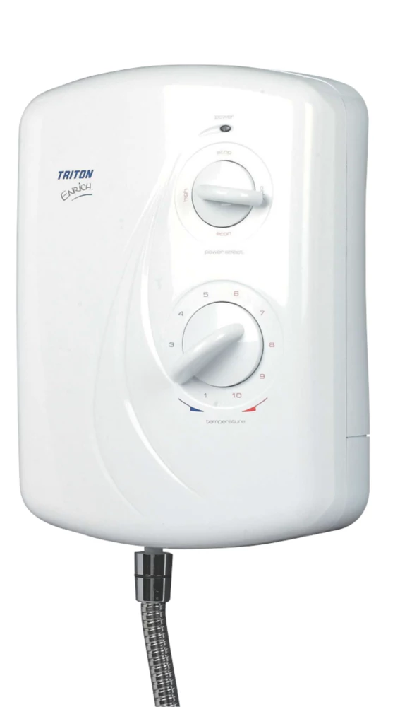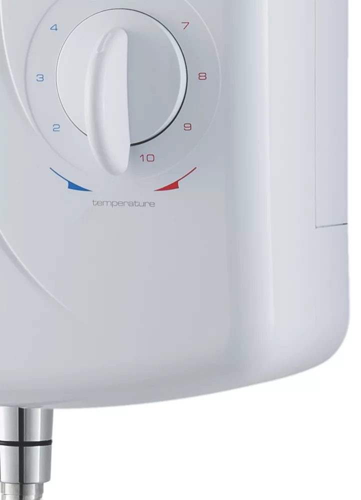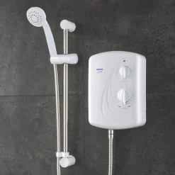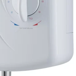 Electric shower featuring multiple cable and water entry points for ease of installation. Simple dial controls for temperature and pressure settings. Supplied with 1m stainless steel chrome hose and adjustable riser rail with shower head holder.