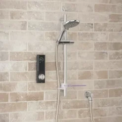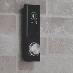 Portrait design digital mixer shower with full text and colour digital display showing temperature and flow settings. Wireless shower control with silent running and 3 customisable pre-sets.
