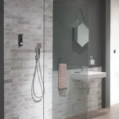 Digital shower with contemporary square design. Suitable for gravity cylinders. Silent running wireless shower control and 3 customisable pre-sets. Divert between a fixed head and handset or run both simultaneously. Full colour digital display showing temperature and flow settings.