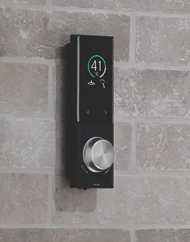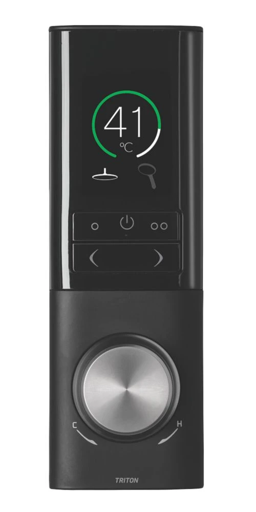 Portrait design digital mixer shower with full text and colour digital display showing temperature and flow settings. Wireless shower control with silent running and 3 customisable pre-sets.