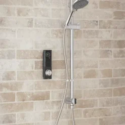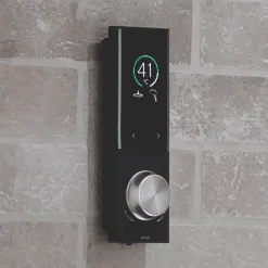 Portrait design digital mixer shower with full text and colour digital display showing temperature and flow settings. Wireless shower control with silent running and 3 customisable pre-sets.