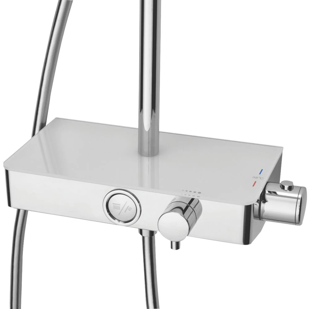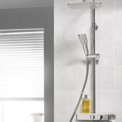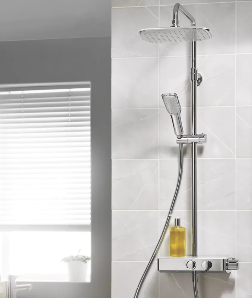 Perfect for either a shower enclosure or over the bath. Offers contemporary style and great performance. The easy-click push-button makes it simple to choose between the drench head shower or the shower handset providing flexible showering for all the family. Combined with a useful and stylish shelf, for keeping shower products close to hand. Ideal for new installations or retrofitting most bar mixers without removing tiles.
