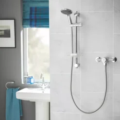 Elegant design with easy to use central controls for flow and temperature. Thermostatic temperature control constantly regulates the water temperature for more precise control and safer showering. Suitable for both high and low pressure water systems.