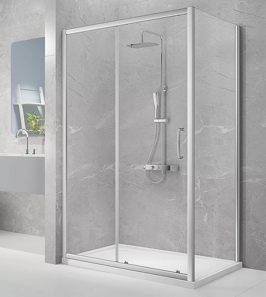 Framed sliding door shower enclosure with easy clean glass coating, concealed fixings and quick release easy clean bottom rollers. Manufactured from 8mm toughened safety glass.