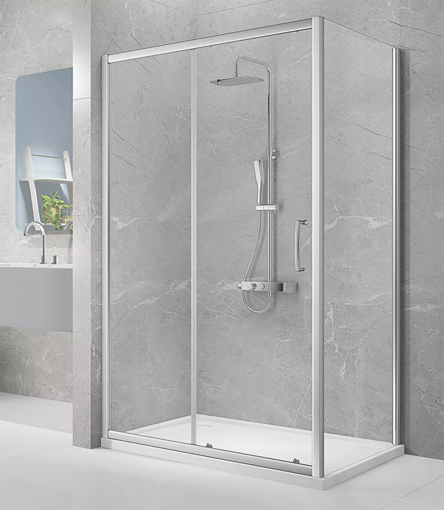 Framed sliding door shower enclosure with easy clean glass coating, concealed fixings and quick release easy clean bottom rollers. Manufactured from 8mm toughened safety glass.