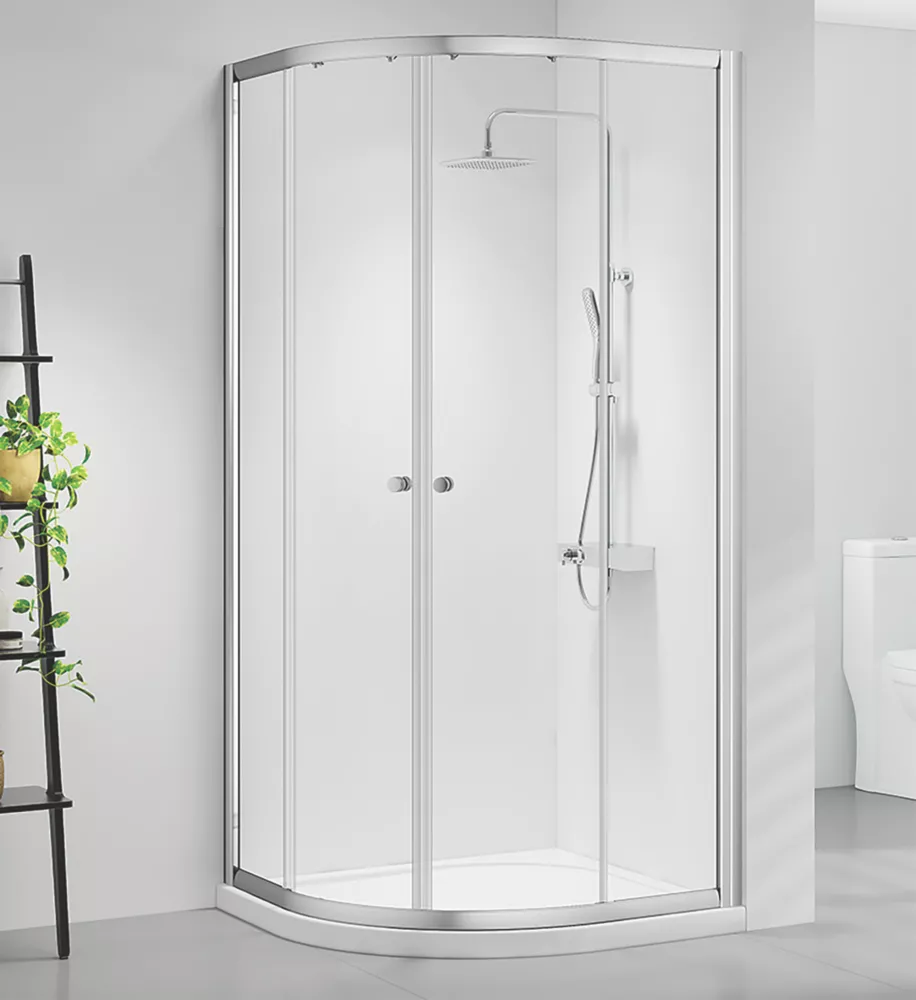 Framed quadrant sliding shower doors with easy clean glass coating and quick release bottom rollers. Easy to fit with pre-assembled fixings and manufactured from 6mm toughened safety glass.