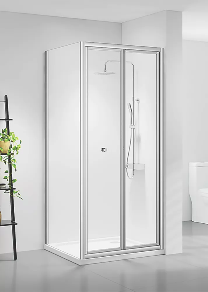 Framed bi-fold door shower enclosure with easy clean glass coating, pre-assembled fixings and quick release easy clean bottom rollers. Manufactured from 4mm toughened safety glass.