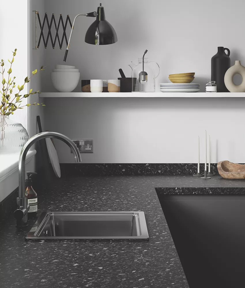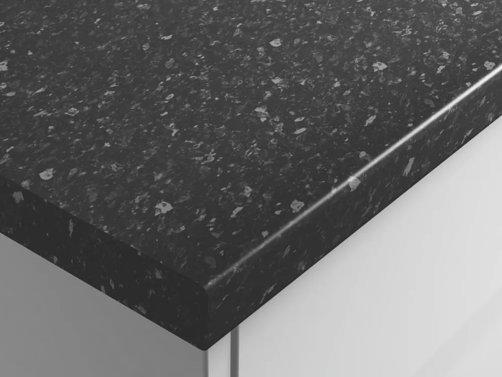 Stone-effect laminate worktop. Post-form front edge with under edge glue seal for water resistance against drips and spills. Supplied with additional edging strip.