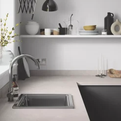 Contemporary grey, quartz-like effect laminate design. Square edge finish with water-resistant glue for improved resistance against drips and spills. Supplied with additional edging strip.