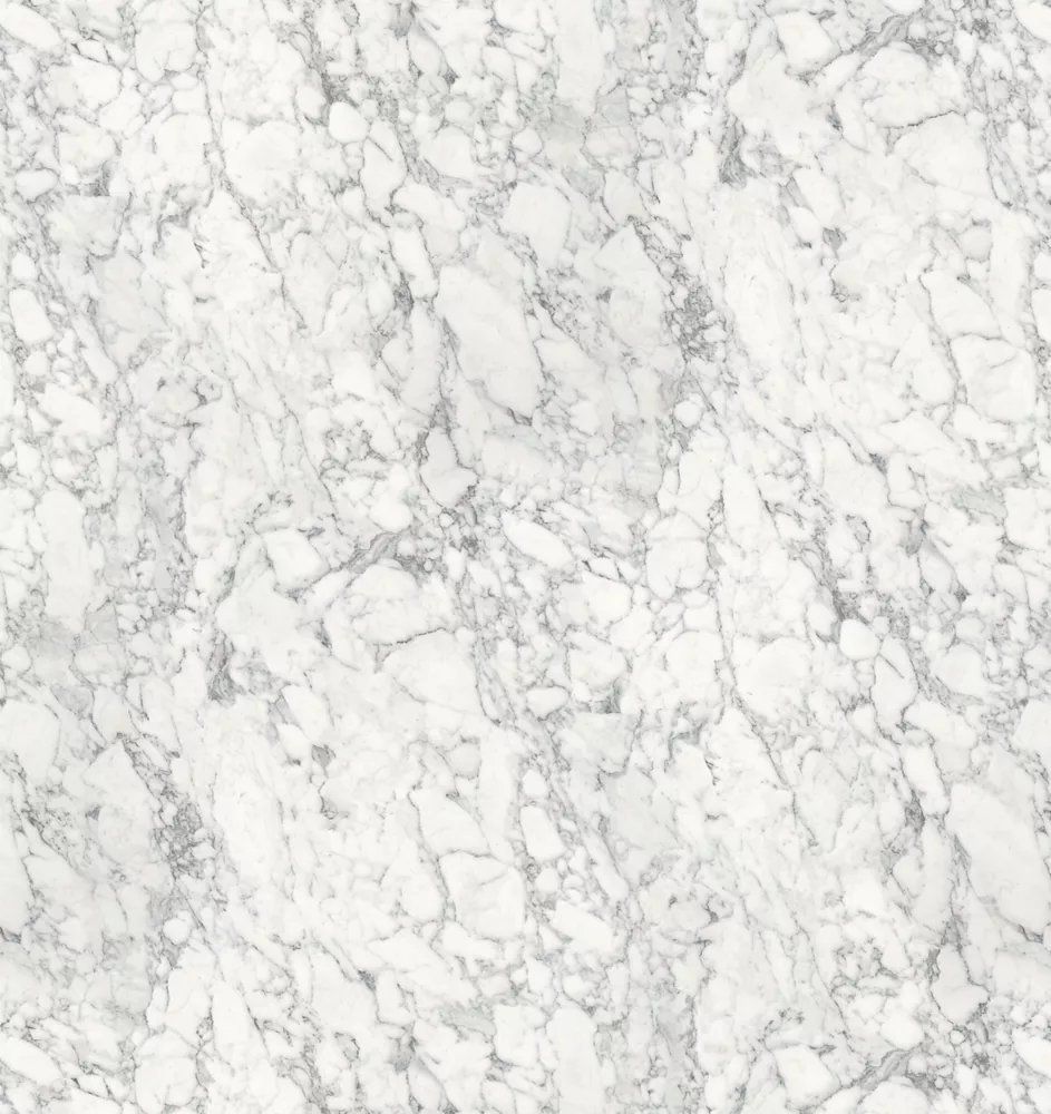 Laminate upstand with white marble effect finish. Cost-effective alternative to tiling.