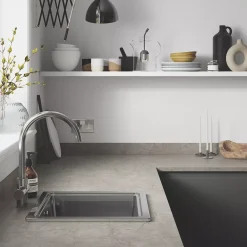 Minos Stone is a grey marble effect laminate with statement veins in subtly shimmering gold and a square edge, giving the realistic effect of naturally cracked stone. Ideal for contemporary kitchens where slim lines rule the design. Factory-finished edge with water-resistant glue for improved water resistsance against drips and spills.